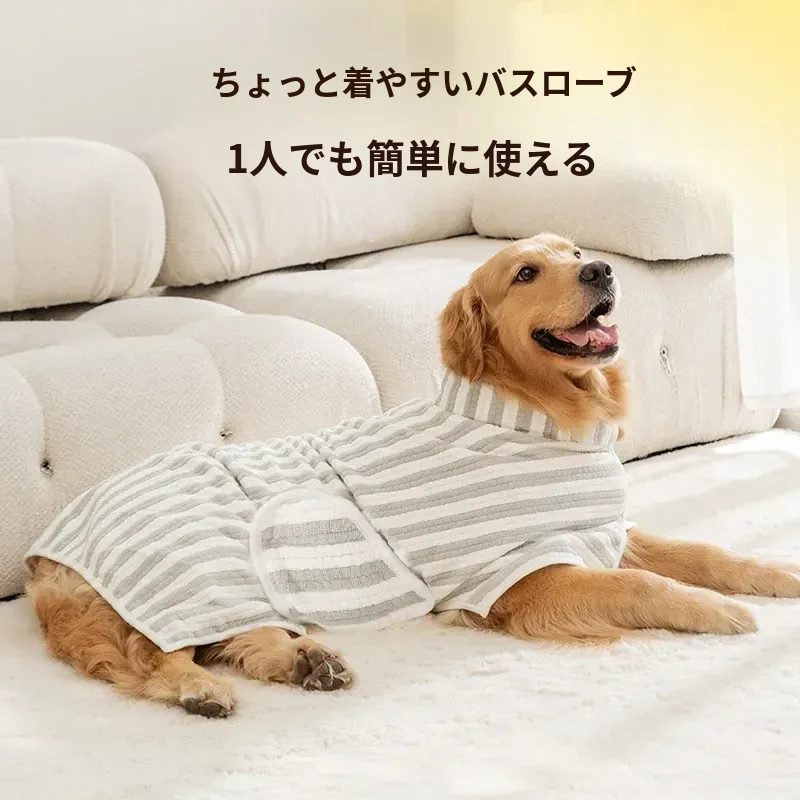 全身包覆の犬用バスローブ!柴犬や中型・大型犬、猫にも最適な速乾吸水タオル。お風呂後のペットを優しく包み込んで、安心感を与えるペット用安らぎ衣。快適なお手入れタイムをお楽しみください!
